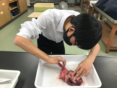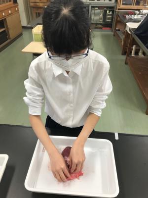 どの生徒も、模型では観察できない膜の様子や感触を体感して感動し、心臓に指を差し込んで、どことどこがつながっているかを発見し、納得の表情をたくさん見せてくれました。