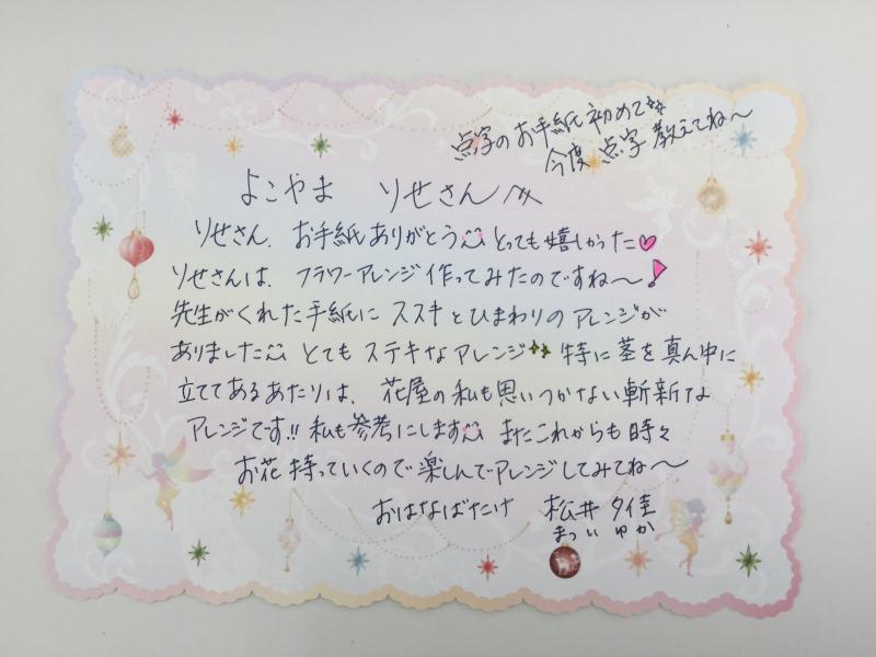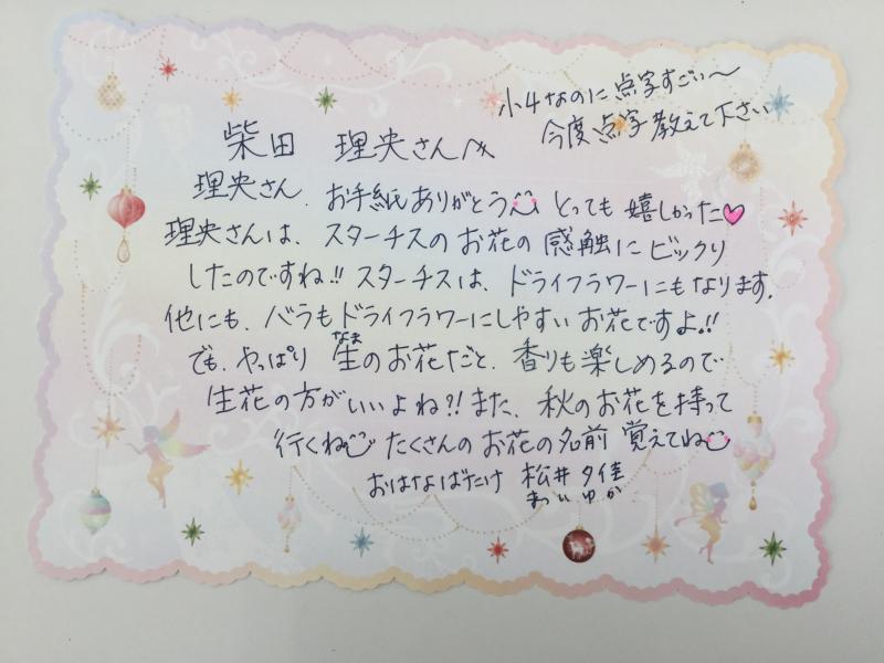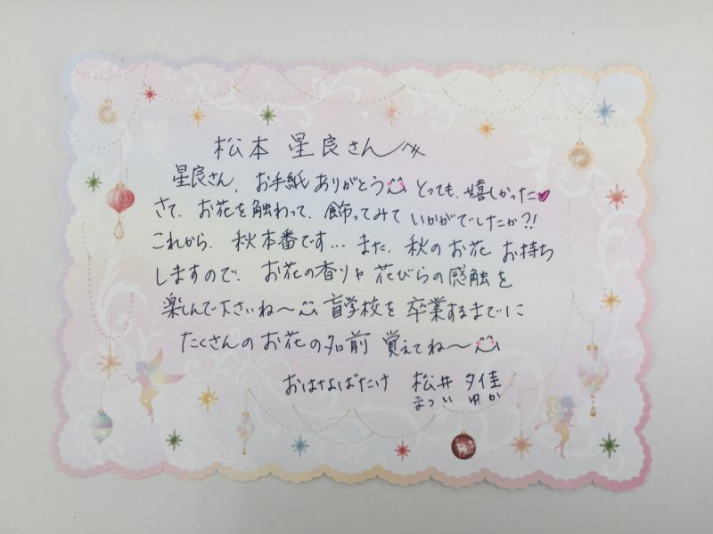 2020年9月30日 11時50分 石引町の花店「おはなばたけ」の松井夕佳様より、たびたびお花の寄贈をしていただいています。本校の児童生徒からお礼の手紙を届けたところ、そのお返事をいただきました。児童生徒は喜んで読んでいました。ありがとうございました。