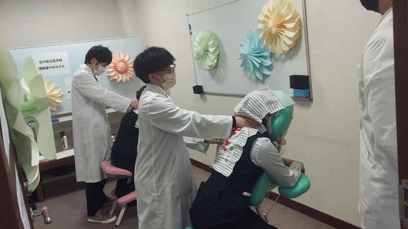 昨年、本校の文化祭でボランティアに来ていただいた三菱UFJ銀行の方から、マッサージ実習のお誘いをいただき、今回の職場実習を実施することができました。マッサージチェアを持参し、26人の方々に15分間のマッサージをさせていただきました。「楽になりました」、「気持ちよかったです」等の声をかけていただき、生徒にとってとても充実した貴重な経験となりました。三菱UFJ銀行金沢支店の皆様、実習をお引き受けいただき、誠にありがとうございました。