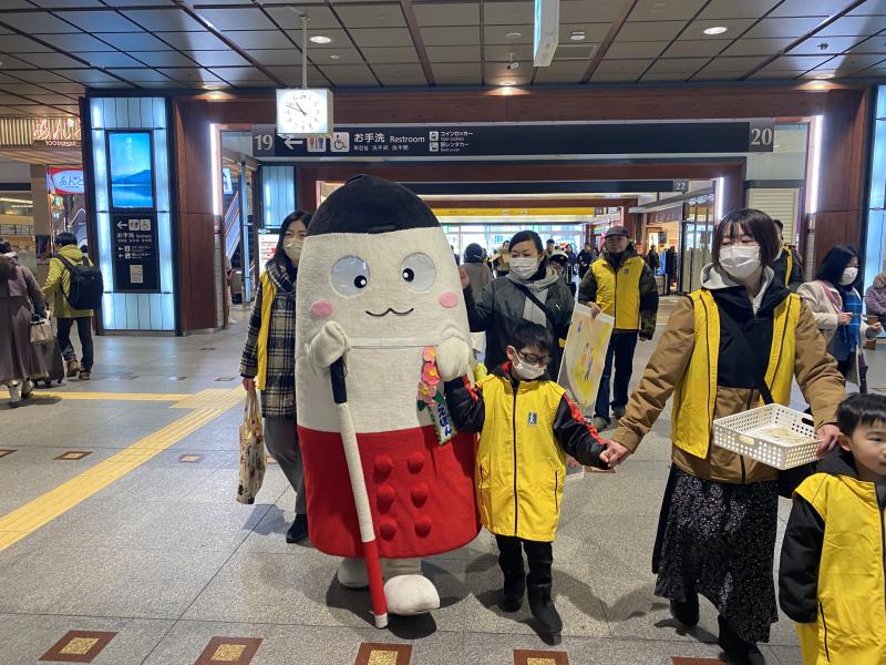 2024年3月15日 22時14分3月10日(日)金沢駅で、児童生徒、保護者、教職員及び、県内の視覚障害の団体の総勢約50名で、コロナ禍で中止になって以来、5年ぶりのティッシュ配りをしました。埼玉県より、白杖の妖精「つえぽん」も、駆けつけてくれ、盛り上げてくれました。