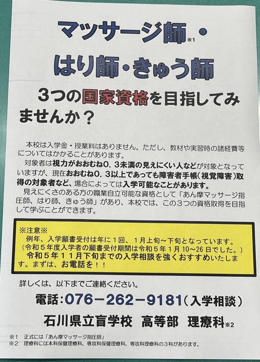 2023年6月1日 13時25分今年度、より多くの方々に盲学校・理療科を知っていただくために理療科啓発ポスターをリニューアルしました。自分の周りに、視覚に見えにくさがあり、生活や仕事等で困っている方がおりましたら、ぜひ、盲学校をご紹介ください。随時、相談をお待ちしています。