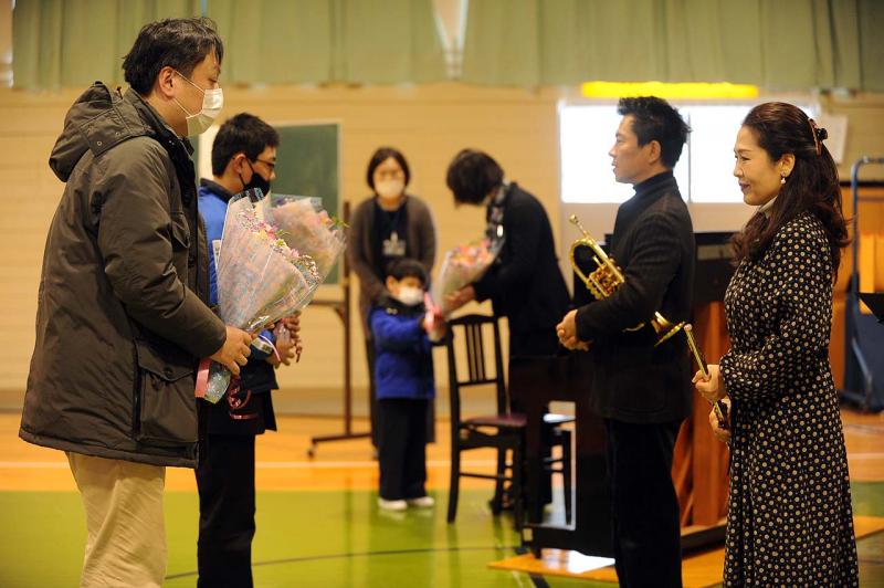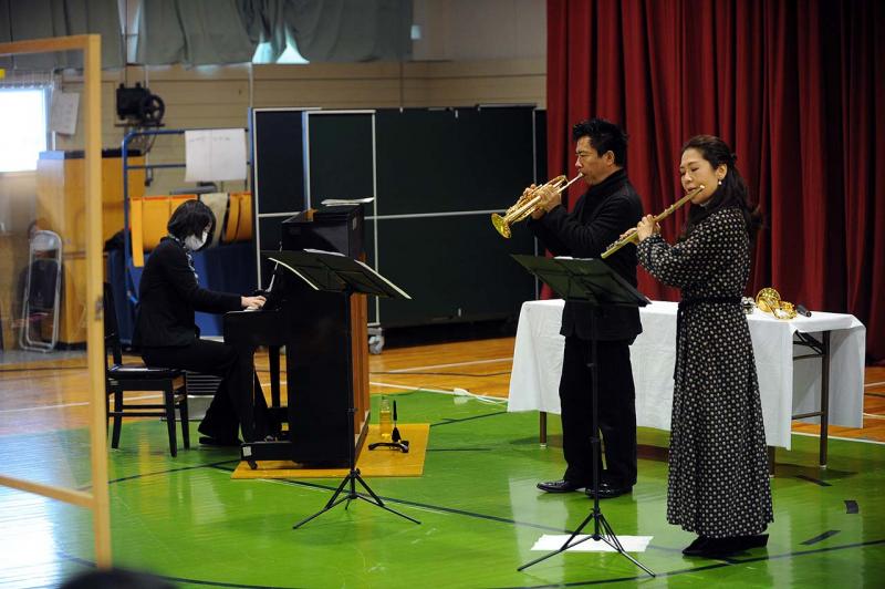 2022年1月15日 16時04分1月14日(金)にオーケストラアンサンブル金沢の藤井幹人さんと、藤井ひとみさん、酒井珠江さんによるふれあいコンサートが行われました。ロンドンデリーや冬の曲メドレー、BELIEVEなど親しみのある曲が演奏されました。トランペット、ソプラノ、フルート、ピアノの力強く、そして優しい音色に児童生徒、保護者、職員皆が魅了されました。
