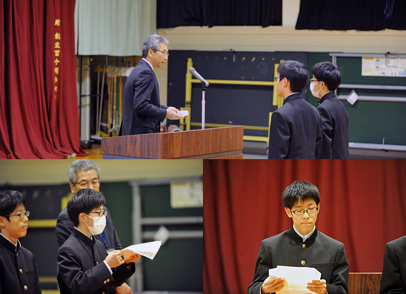 2人は校長先生からのお祝いの言葉を聞き、記念品を受け取った後、それぞれの言葉でこれまでの思い出や将来への希望、周りへの感謝の気持ちを述べていました。