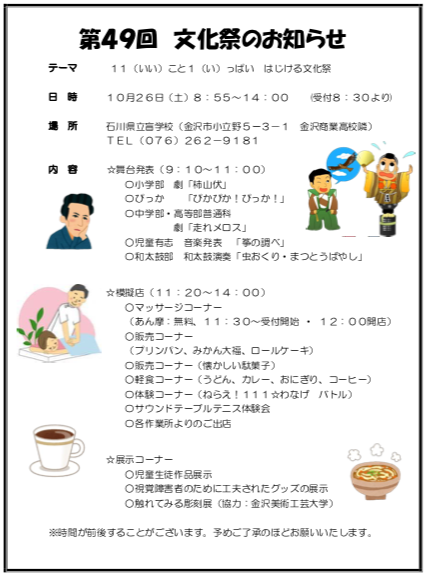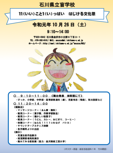 日 時 10月26日(土)8:55~14:00 場 所 石川県立盲学校 TEL(076)262-9181 |