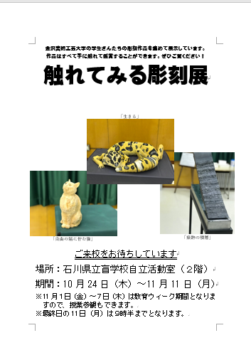 ただいま、本校では、金沢美術工芸大学の学生さんたちの彫刻作品を集めて「触れてみる彫刻展」という作品展をおこなっています。