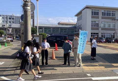 2024年9月18日 09時32分9月3日(火)から9月6日(金)、崎浦地区婦人会、小立野校下婦人会のみなさんと、本校校門付近で、グッドマナーキャンペーンを行いました。公共マナーの大切さや交通ルールの遵守等を呼びかけました。