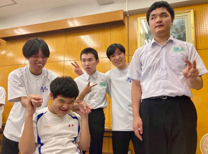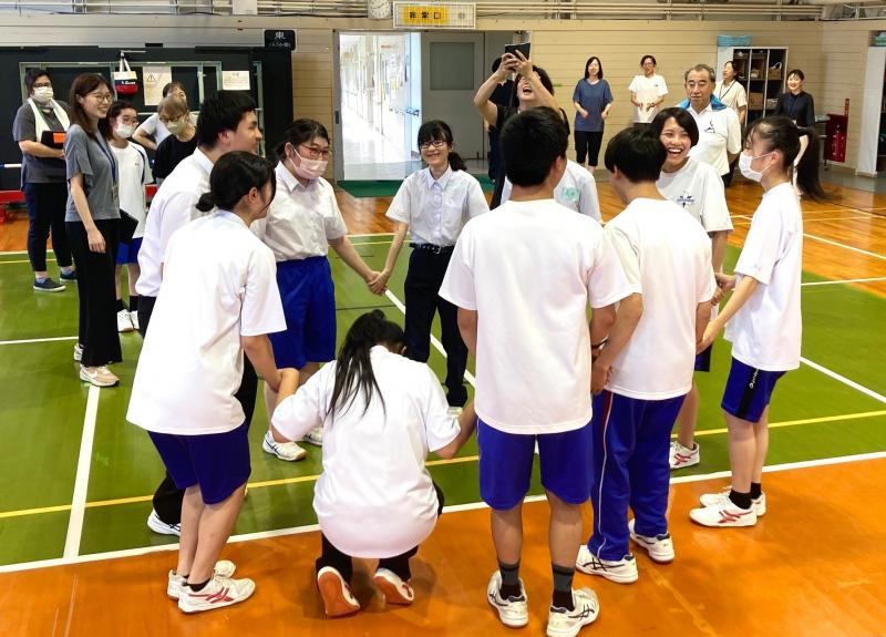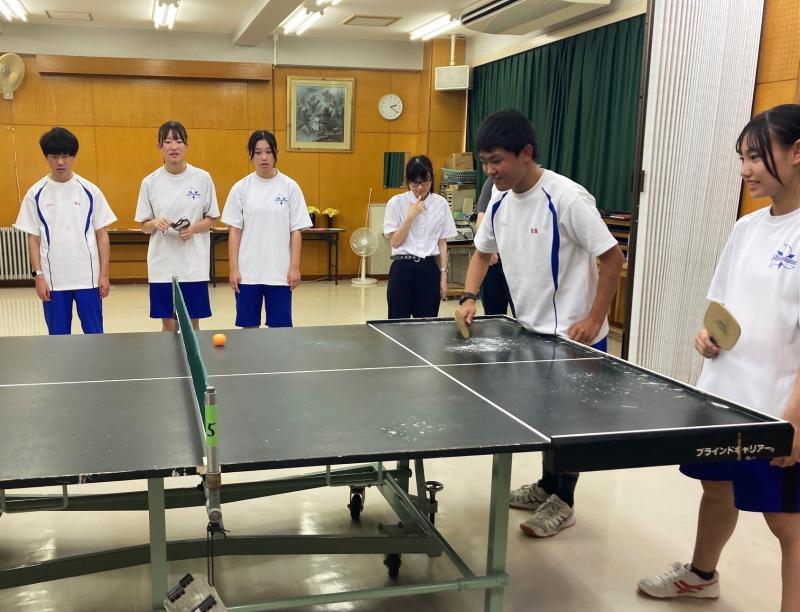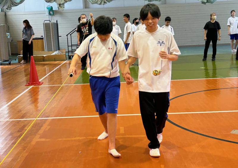 その後、本校の運動会競技の「フープリレー」や「お玉リレー」、部活動の一つの「サウンドテーブルテニス」を一緒に取り組む中で、声を掛け合い、笑顔があふれていました。
