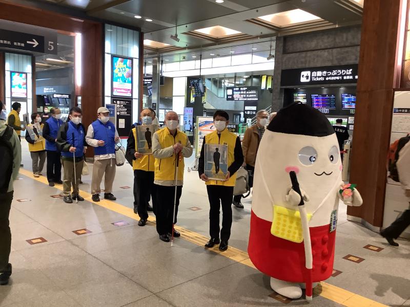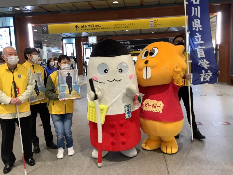 埼玉県からやって来た点字ブロック啓発活動のゆるキャラ「つえぽん」も一緒に金沢駅を周りました。