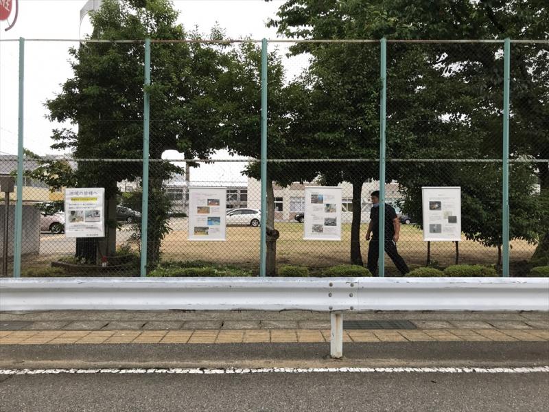 2020年7月3日 12時00分学校前のフェンスを利用して、学校再開後の各学部の様子や、児童生徒の作品などを紹介したパネルを設置しました。