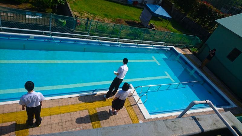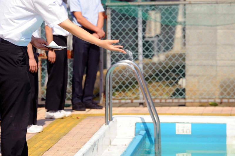 全員で水の神様に安全を祈願した後、校長先生の話を聞き、生徒会長たちが清めの塩やお神酒をプールにまいて、式は終了となりました。