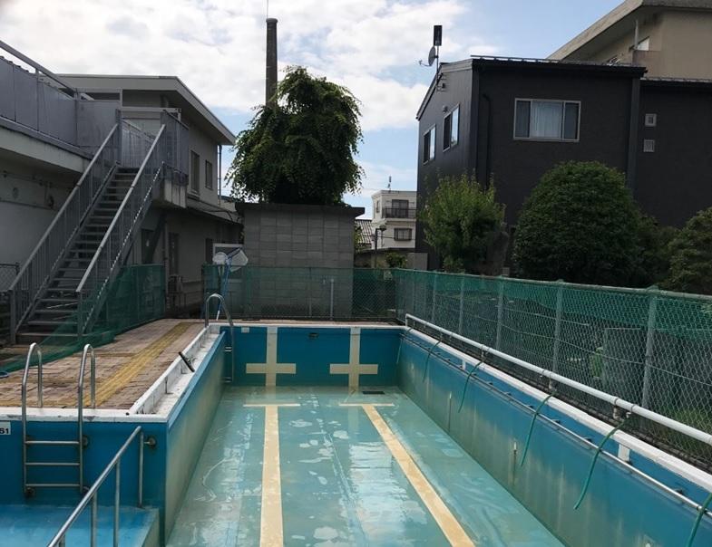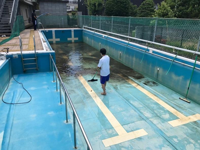 2020年6月11日 14時00分6月になってここ数日、真夏のような暑さが続く中、10日(水)にプール清掃が行われました。底にたまった枯葉を取り除き、水で砂や泥を流して清掃終了です。後は水を張って、プール開きを待つばかりとなりました。