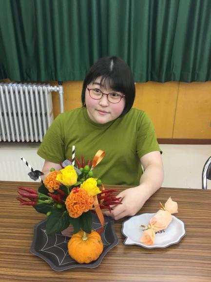 ケイトウやユリ、唐辛子、バラなどを使ってスタッフの方にサポートしてもらいながらベースを作りました。そこに、リボンやスティック、かぼちゃを飾ってハロウィンらしいフラワーアレンジメントを作ることが出来ました。