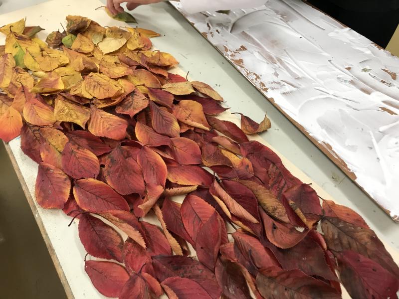 落ち葉の色を見て、色の違いに気をつけながら板に貼っていきます。