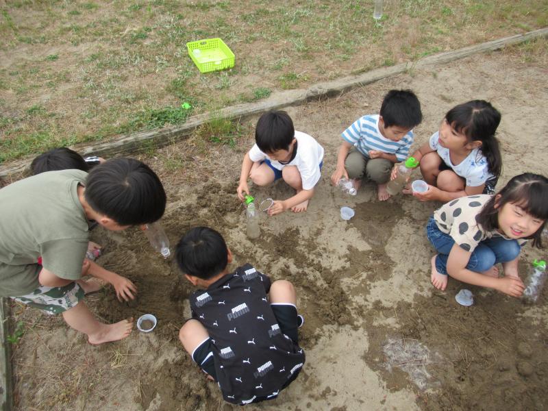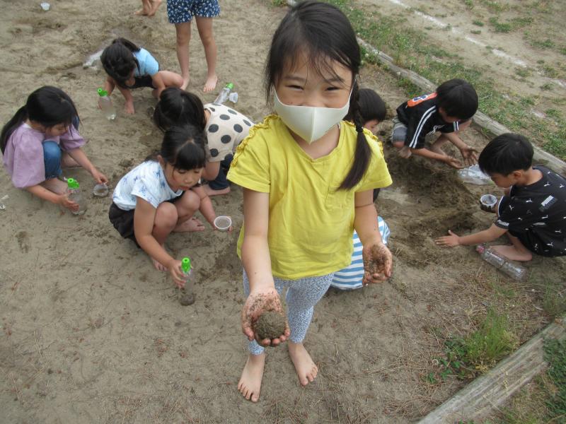 砂山を作ったり、泥団子を作ったり、中には水をかけて大きな川を友達と協力して作る様子も見られました。