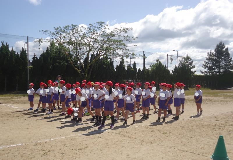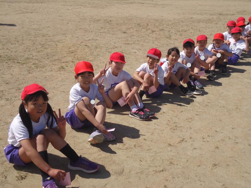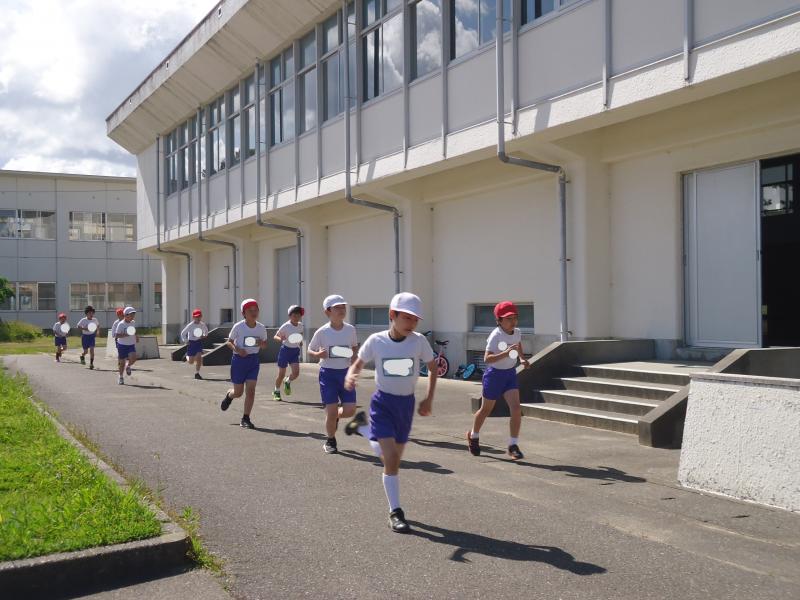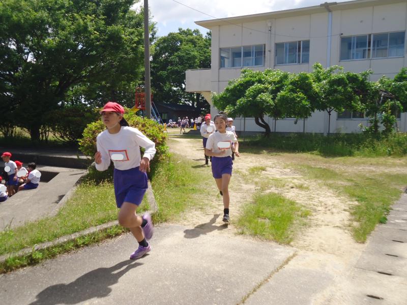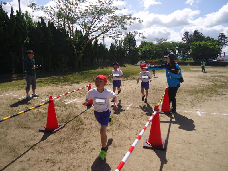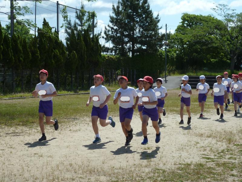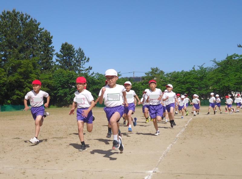 1年生は790m(トラック1周+外周1周)、2年生は940m(トラック2周+外周1周)、中学年は1,430m(トラック1周+外周2周)高学年は1,880m(トラック大回り2周+外周2周)を走りました。