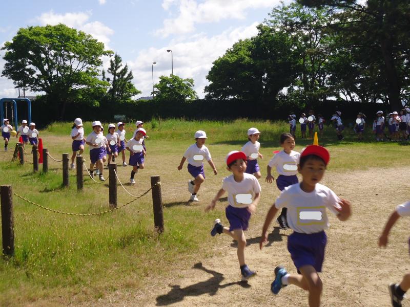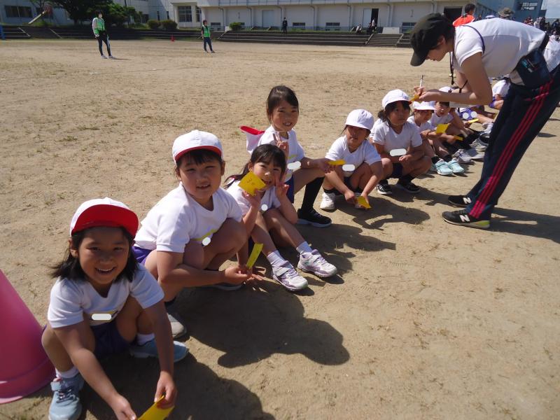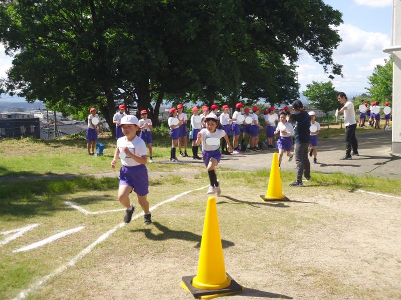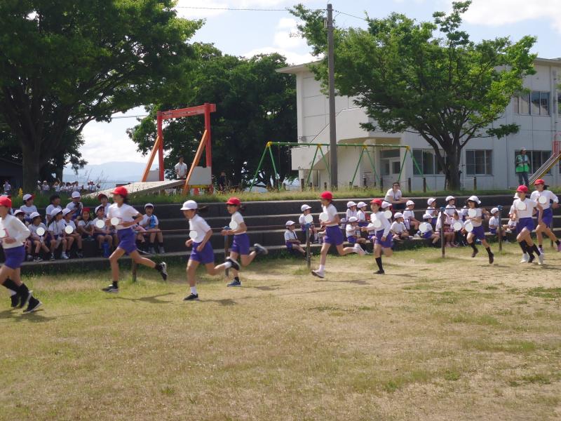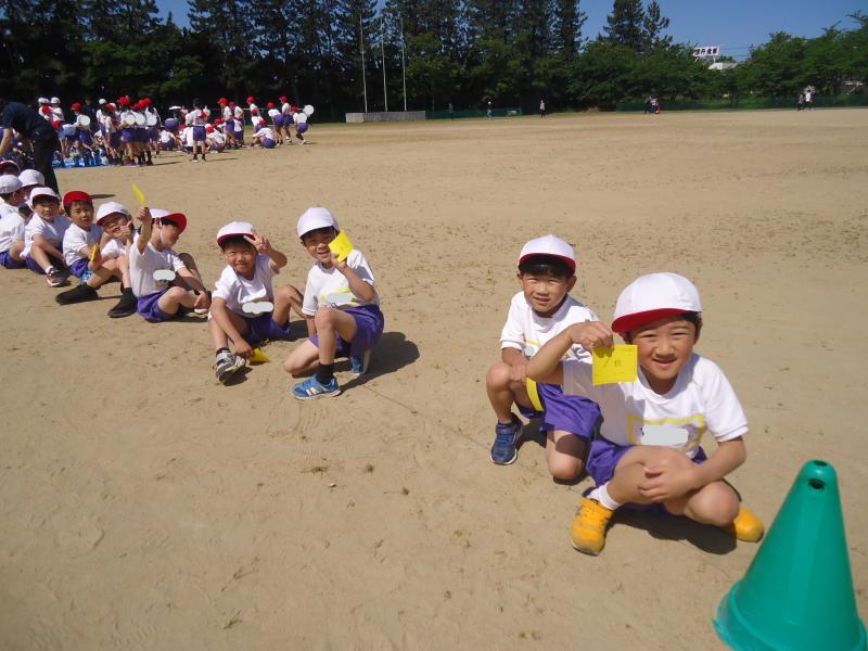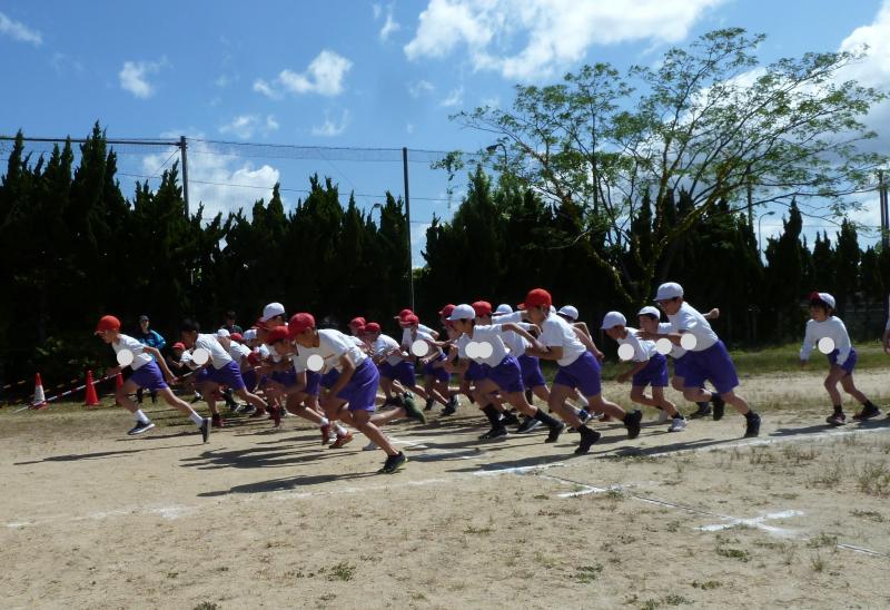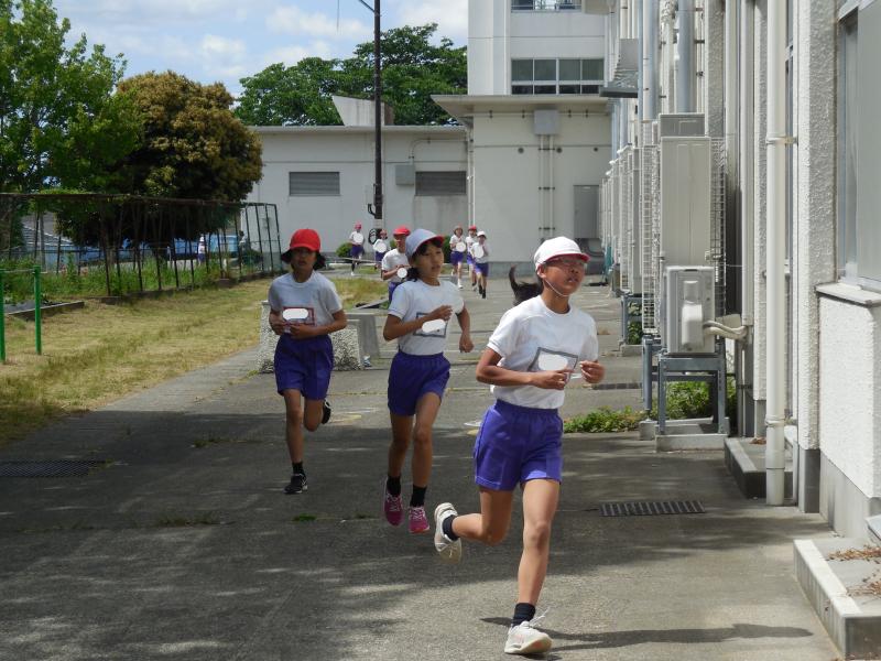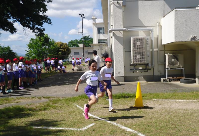 1年生は790m(トラック1周+外周1周)、2年生は940m(トラック2周+外周1周)、中学年は1,430m(トラック1周+外周2周)高学年は1,880m(トラック大回り2周+外周2周)を走りました。