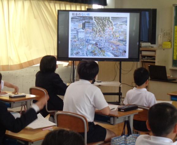 町の税務課の方をお招きして、税金はどんなことに使われているのか、もしなかったらどうなってしまうのかなど、動画やスライドを使ってわかりやすく説明していただきました。