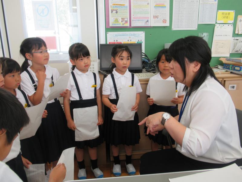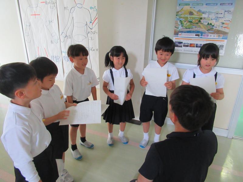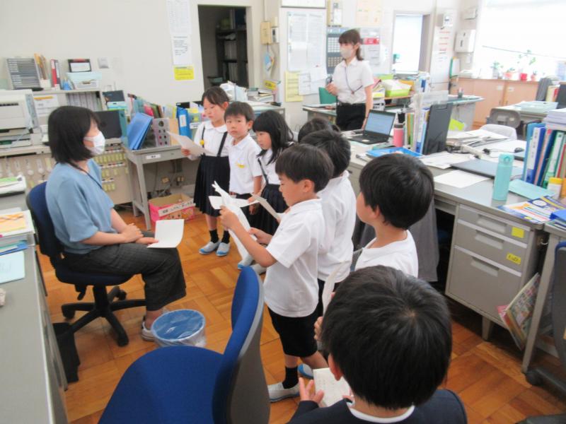 生活科の「学校の人と話してみよう」の授業で、学校の先生にインタビューをしました。子どもたちが、「話を聞きたい!」と思う先生の所へ行き、自分たちで考えた質問を上手に尋ねていました。