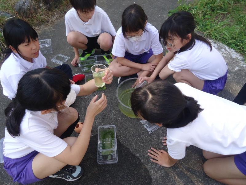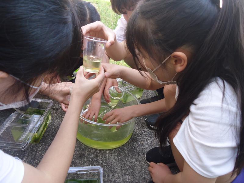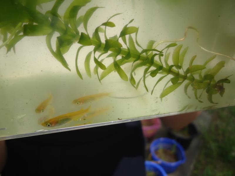 5年生が、中庭で理科の学習をしています。自分のめだかを選んでいました。