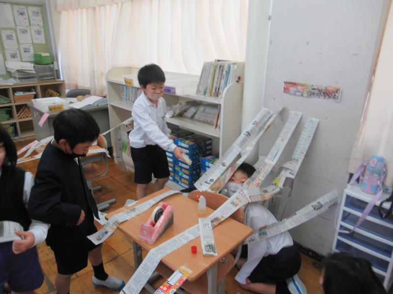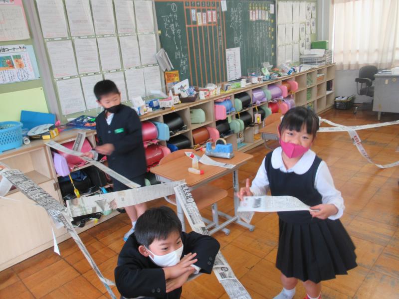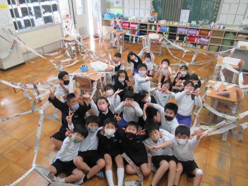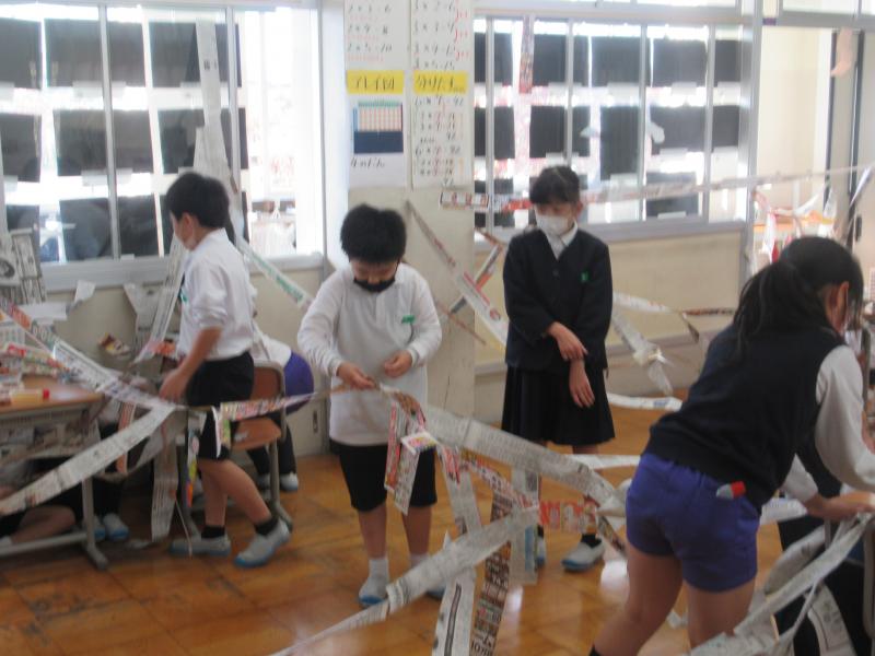 図工の学習で新聞紙やチラシをたくさんつないで一つの作品をみんなで作りました。