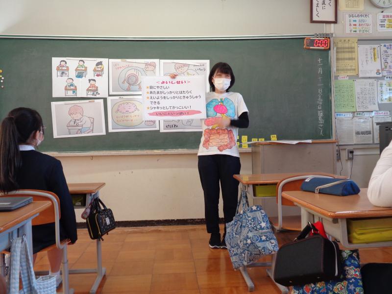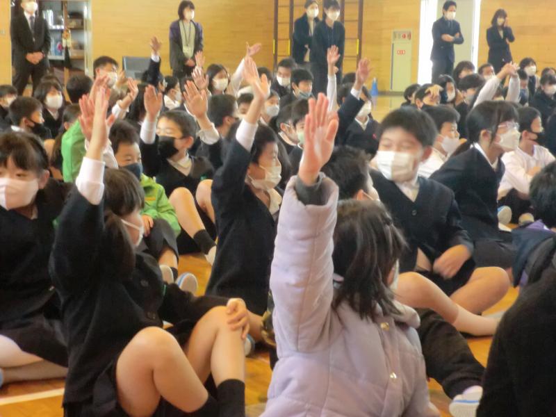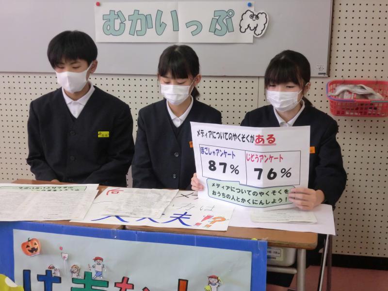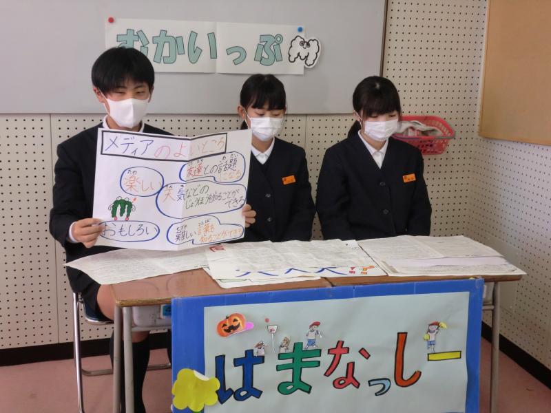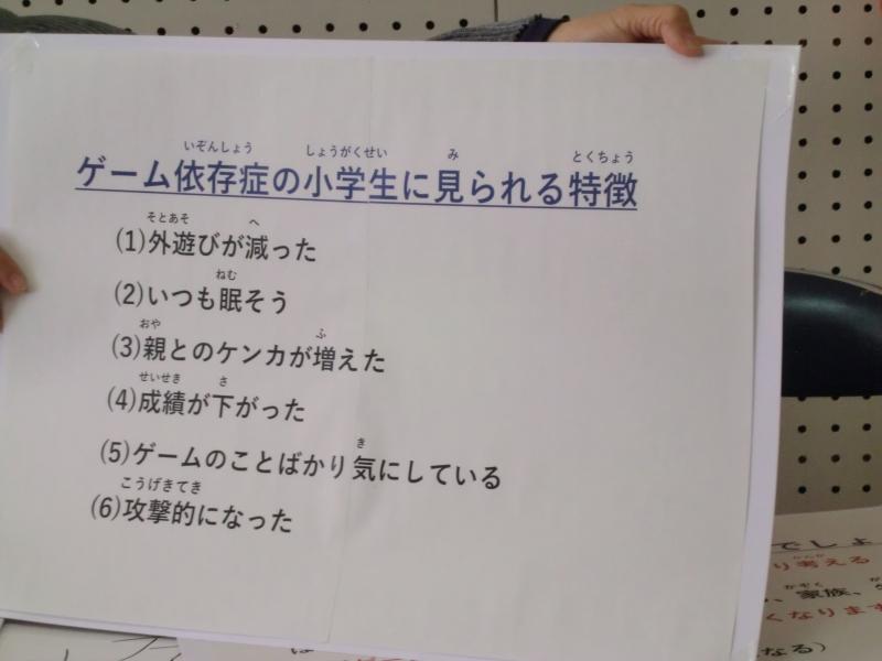 これを受け養護教諭の野竹先生からは、目など体に与える悪影響について、本校スクールカウンセラーの平口先生からは、メディアと上手に付き合う方法をクイズも交えて教えていただきました。