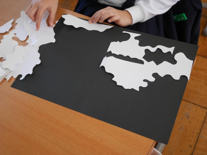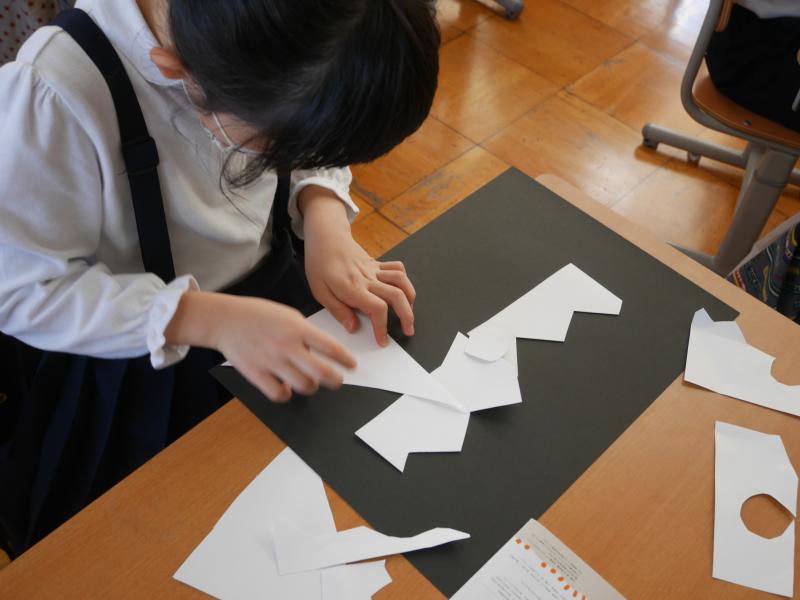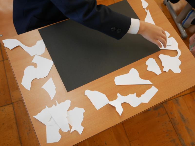 図工「はさみのあーと」という学習で、切った形から想像を膨らまし、作品に表していく活動を行いました。