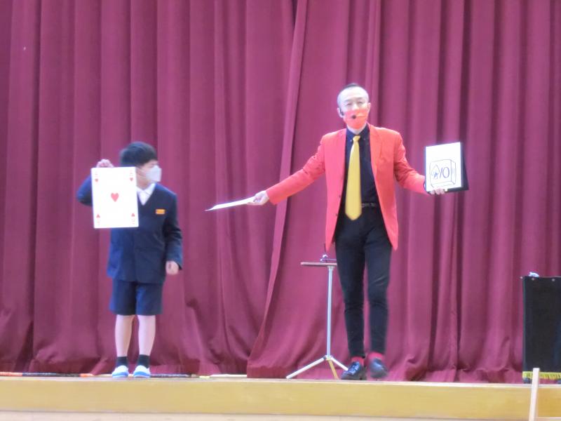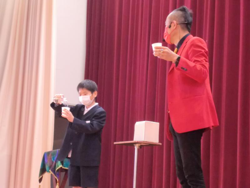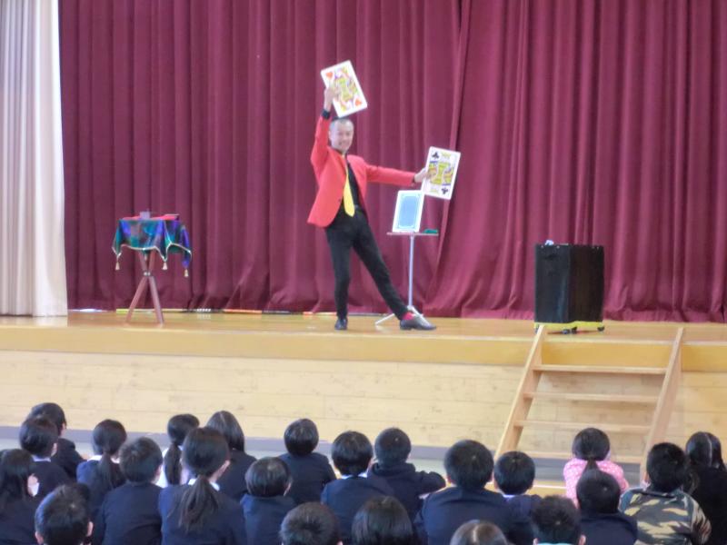 体育館に全校集まってのマジックショー!! 次から次へと繰り広げられる「不思議!」「びっくり!!」に子供たちも目を丸くしたり歓声をあげたり・・・