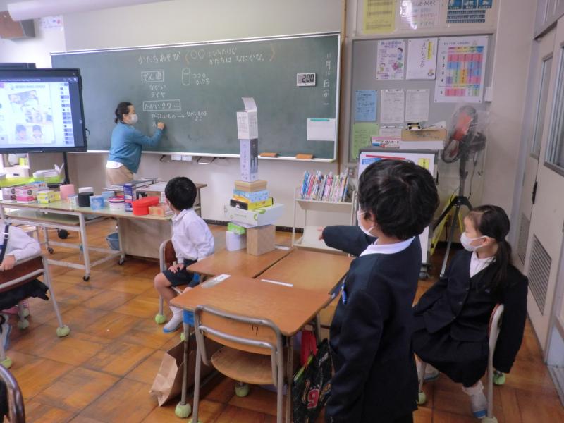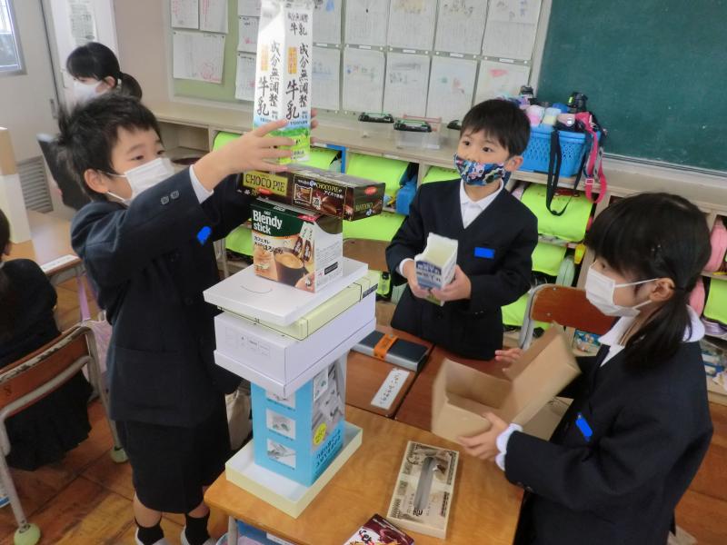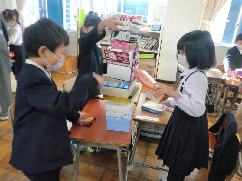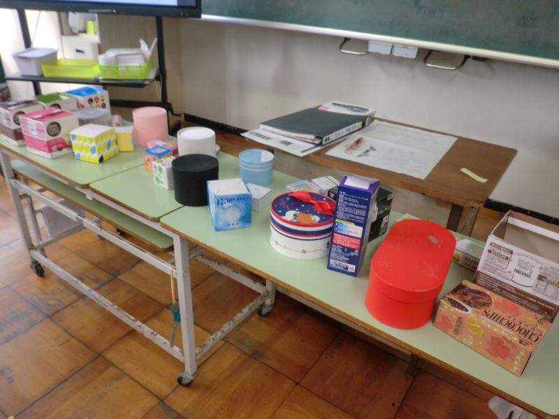 1年生がおうちから持ってきたそれぞれの箱を使って、算数「かたちあそび」の学習をしていました。