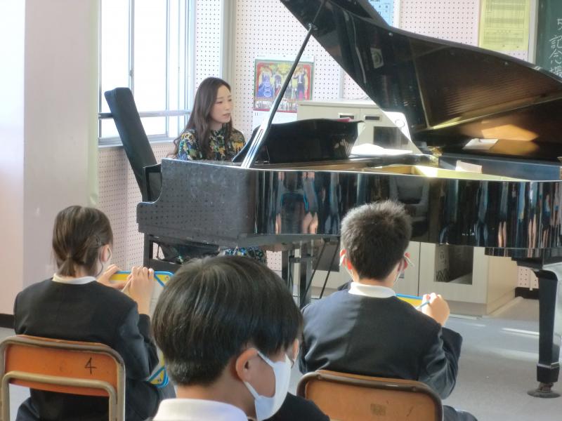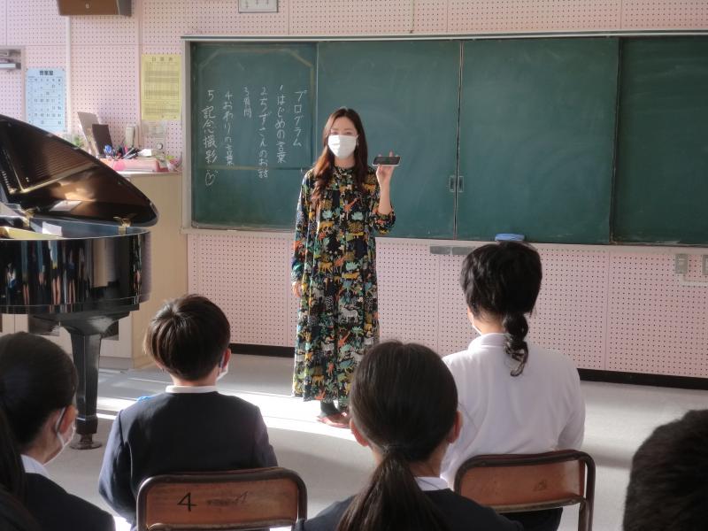 11月25日(金)6年生が、シンガーソングライターの千寿さんからお仕事について、また、千寿さんの生き方・考え方などを、すてきな弾き語りとともに聴かせていただきました。