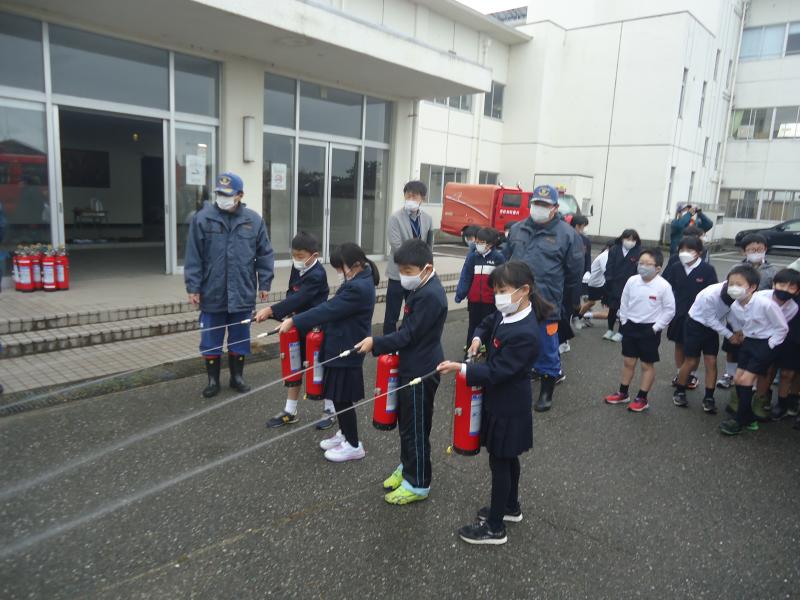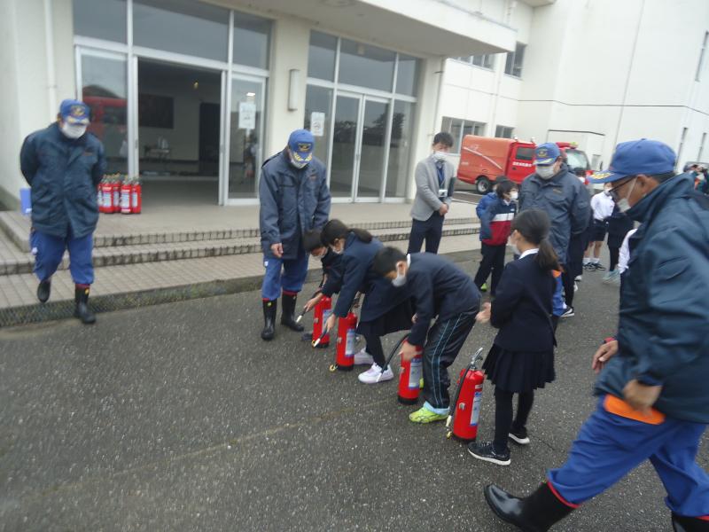 消防団員と消防署員の方が来て下さり、消防団の活動や防災意識を高めるためのお話を聞かせていただきました。また、児童からのたくさんの質問(仕事内容や仕事にかける思い、施設にあるものなど・・・)にも丁寧に応えていただきました。最後に、水消化器を使って一人一人初期消火の体験をしました。