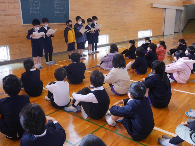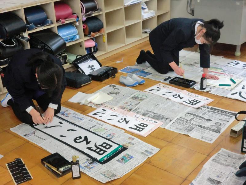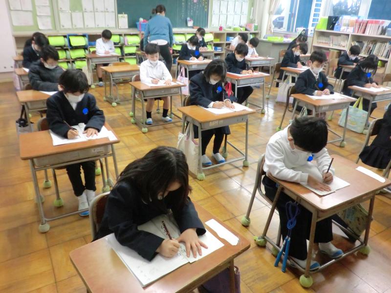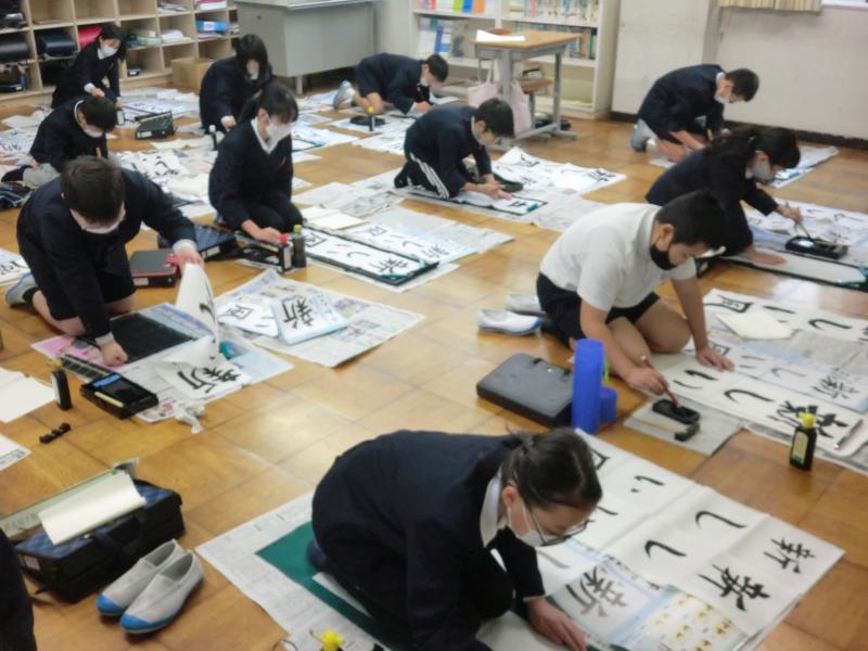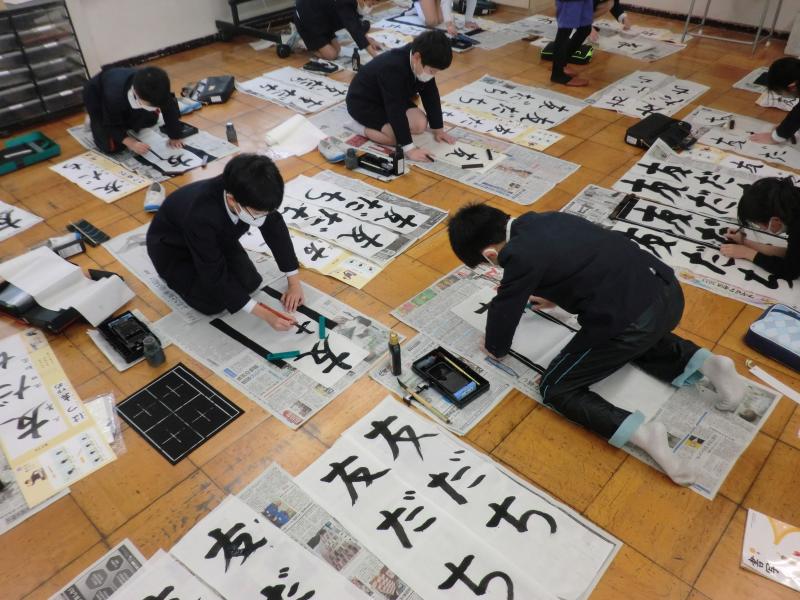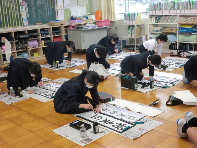 2限は全校児童参加の書き初め大会。みんな、2学期から冬休みにかけてがんばった練習の成果を発揮・・・・・・ ♪「春の海」をバックに、集中して一生懸命に取り組んでいました。