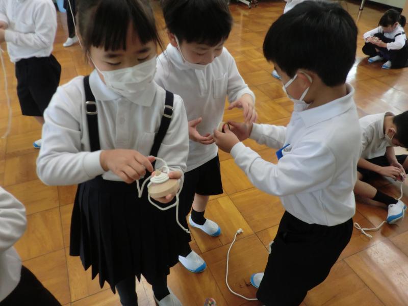 こま、けん玉、お手玉、おはじき・・・慣れない遊びに四苦八苦しながらも、先生や得意な友達に教えてもらいながら要領を得ていく子供たち。「できた!見て、見て!」ニコニコ笑顔が増えてきます。