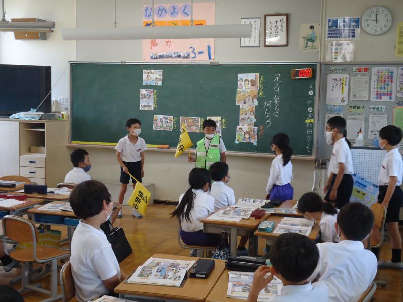 同時に教職員は、児童への適切な指示、児童の安否を確認、校舎の状況確認、本部(職員室)への迅速な報告、けが人を想定した救護の派遣等を連携して行う訓練をしました。