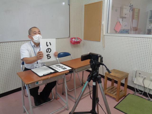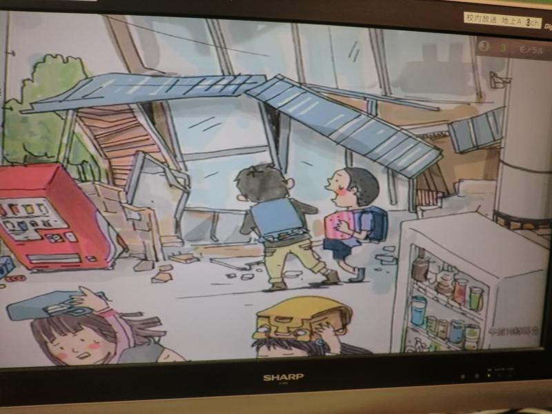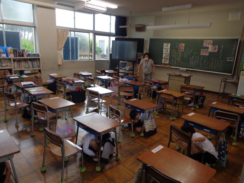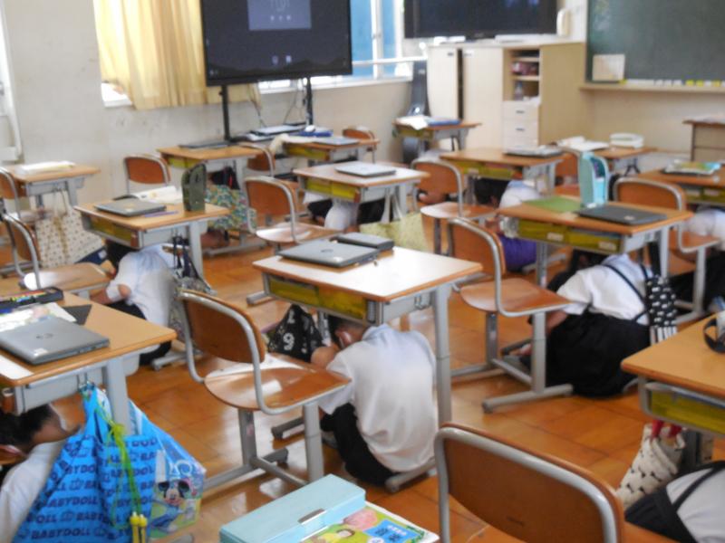 地震の恐ろしさや、学校や登下校中に地震が起きたらどうするか・・・などを、DVDで学びんだ後、防災無線の合図で「しゃがむ・かくれる・じっとする」=「身を守る行動」をすばやく行いました。