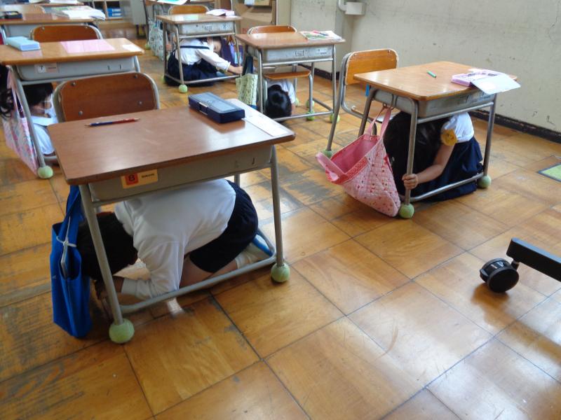 机の下に身を隠し、頭・体をしっかり守る=「命を守る」行動ができていました。