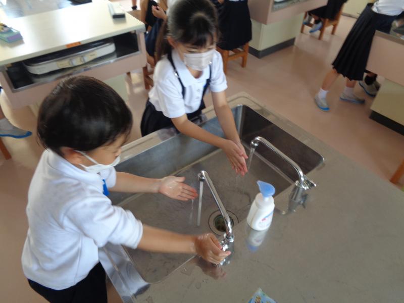 1年生が、保健室の野竹先生と手洗いの学習をしました。どんな時に、どんな手洗いをするといいのかな?1年生のみんなは、お話もしっかりと聞き、手洗い実験にも真剣に取り組んでいました。