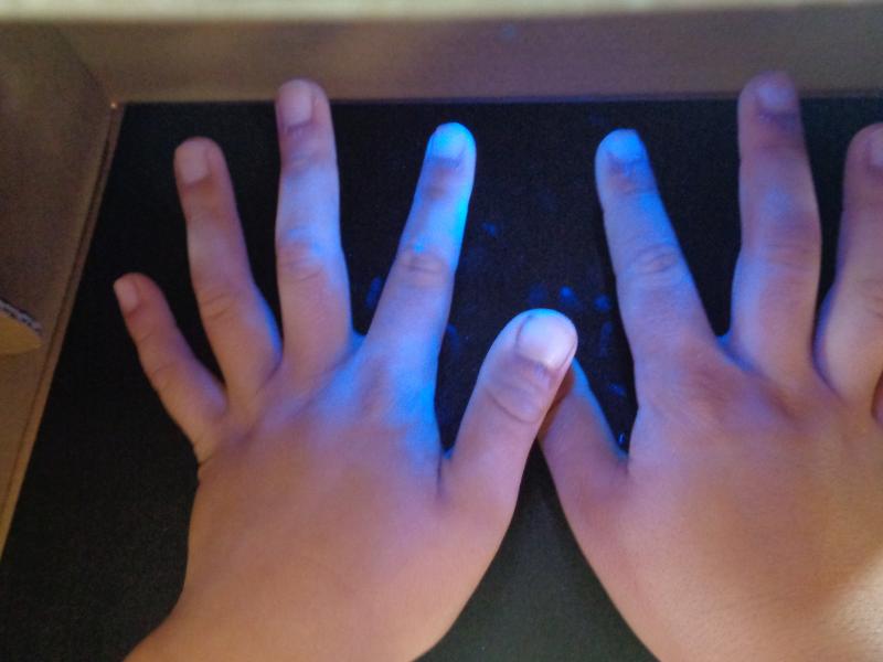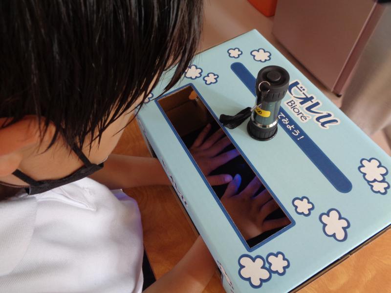 普段の手洗いで、洗い残しはないかな?・・・・・・実験では、手に優しい特殊な薬剤を付けてブラックライトに当てて調べてみると・・・・・・指先や爪の周り、手首、手の甲に汚れが残る児童が多かったです。