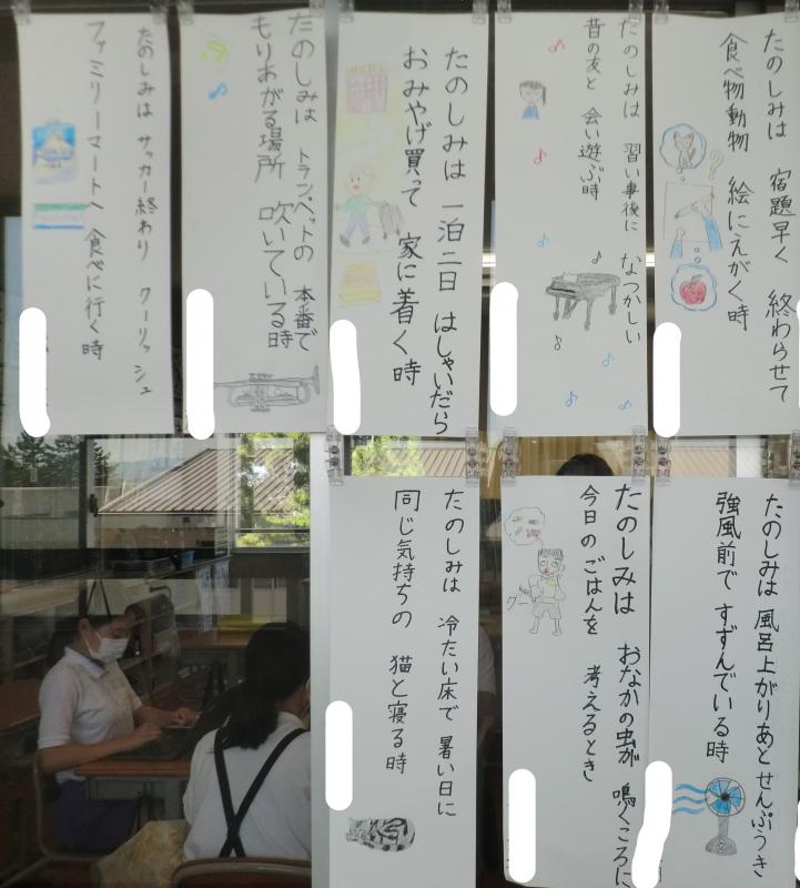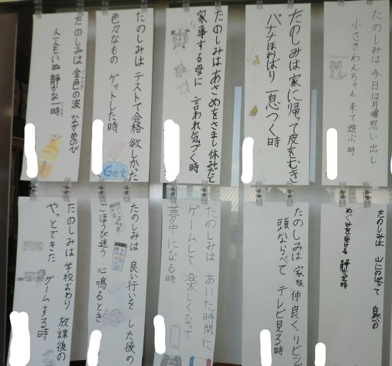 6年生が、短歌を作りました。生活の中のさまざまな場面から、「たのしみ」を探して表現しました。言葉を選んだり、並べ方を変えたりして、よりよい表現を工夫するため、友達同士アドバイスし合って完成させました。