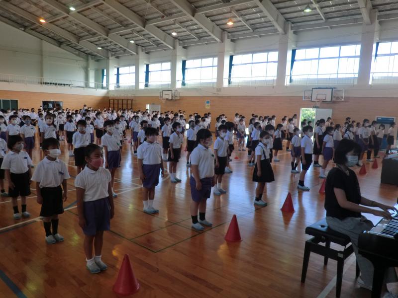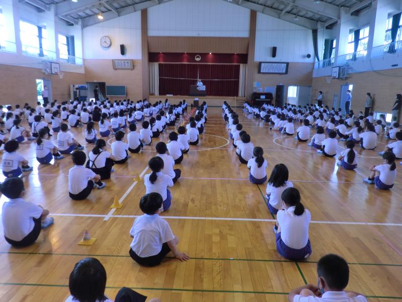7月の全校集会は、2年ぶりに全校が体育館に集合して行うことができました。1m以上の間隔をしっかり開けてきれいに並んでいます。