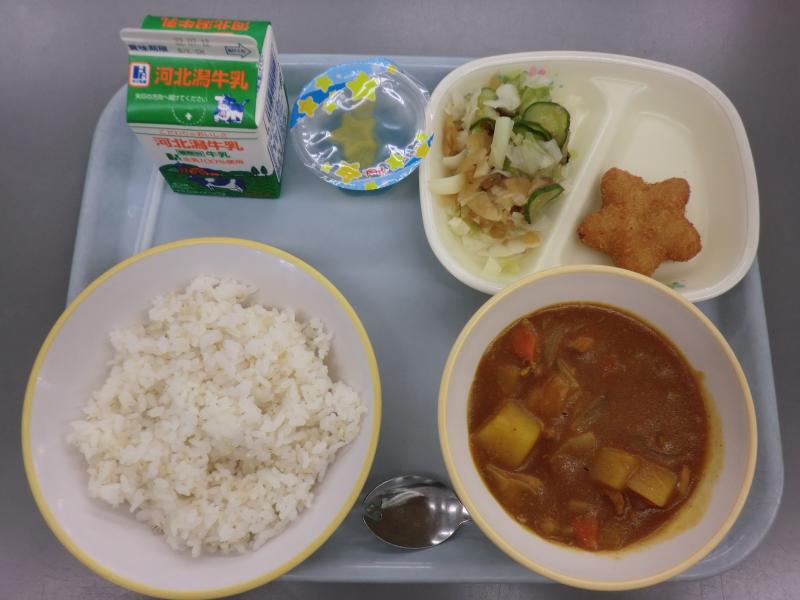 お昼の給食は、特別な「たなばたこんだて」子どもたちの大好きなカレーライスとお星様のコロッケ・・・デザートはたなばたゼリーでした。