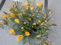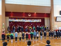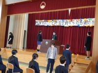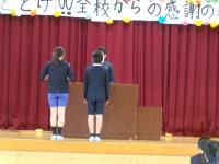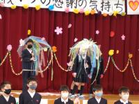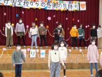 会の最後に、校長先生から各学年の出し物についてふり返りをしていただき、6年生は退場しました。退場する際には、県よりご寄付いただいた「エラリーフローラー」が一人一本ずつプレゼントされました。花には一人に一枚ずつ5年生からの心温まるメッセージカードも添えられていました。