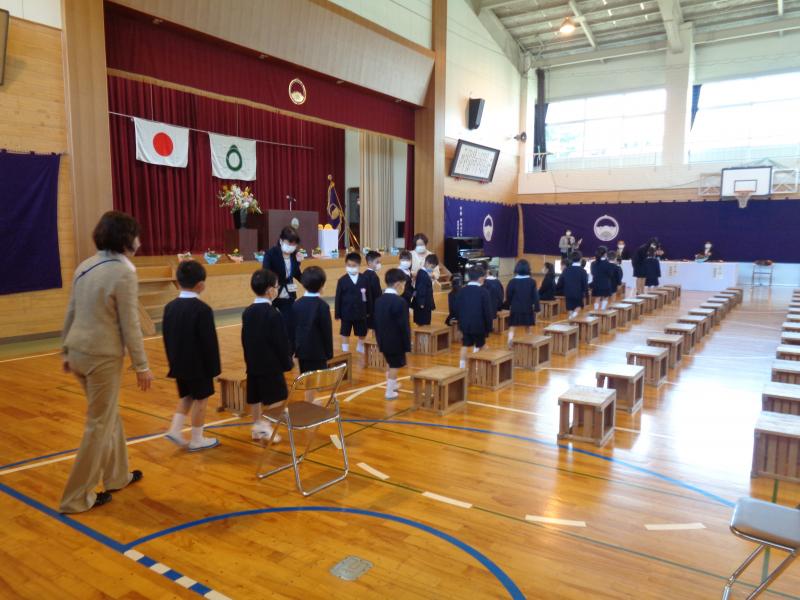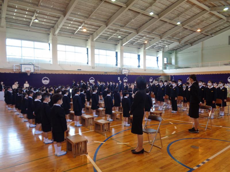 ピカピカのランドセルを背に、少し緊張した面持ちで入学式を迎えた新1年生。入学式では、保護者の皆様に見守られる中、静かにお行儀よくすわって、真剣に校長先生のお話や6年生の迎える言葉を聞くことができました。