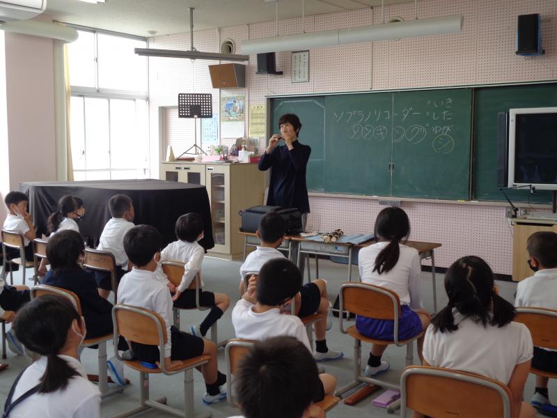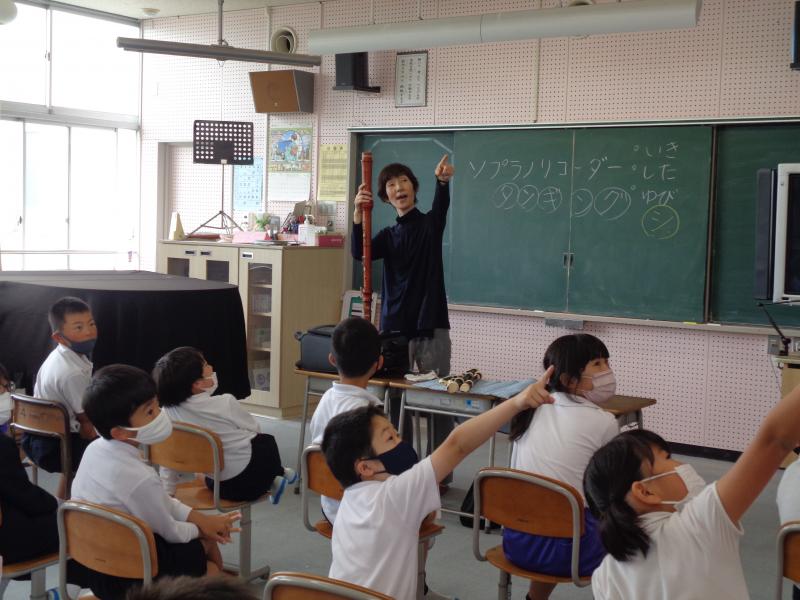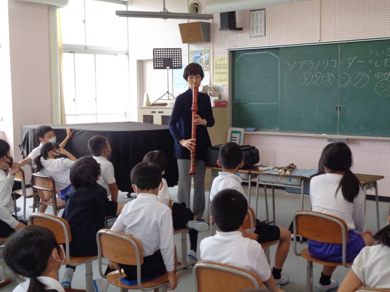 リコーダー奏者の中村先生を講師にお招きし、リコーダーについてたくさんのことを学びました。リコーダーには、爪楊枝くらいの小さいものから両手で抱えないと支えられないくらいの大きなものまで・・・・・・紹介されるたびに歓声が!