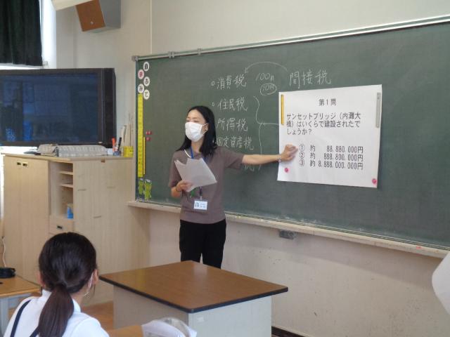 税にはいろいろな種類の税があることや、町の様々なしくみ・施設が税によって成り立っていることが、クイズ形式によって話されました。6年生はとても興味津々な表情で参加していました。