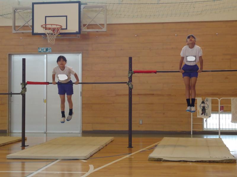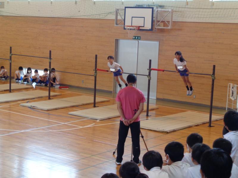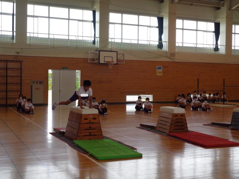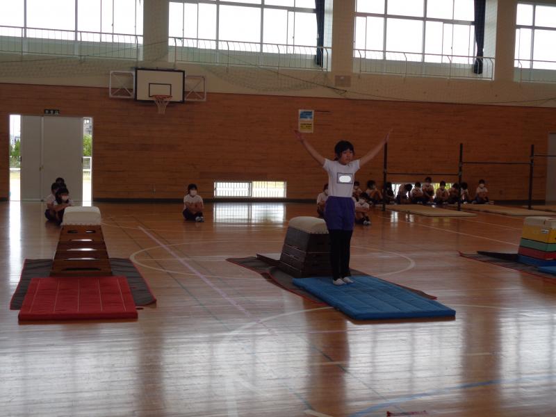 マット、鉄棒、跳び箱・・・・・・全員が一人一人大きな声で名前を言い、精一杯演技を披露することができました。