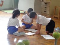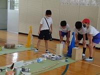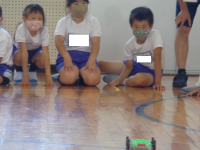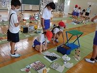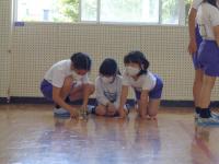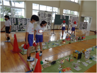 3年生の理科ではゴムを伸ばした時に元に戻ろうとする働きを使うことで、物を動かすことが出来ることを学びました。ゴムを長くのばすほど、物を動かす働きは大きくなることを学習した後に、ゴールインゲームをしていました。スタート地点から7m離れた駐車場に車をぴたりと駐車させるゲームです。「1回目は12cm伸ばしたけれど、ちょっと届かなかったから、次は13cmにしてみよう。」と試行錯誤しながら挑戦していました。グループで相談して長さを決め、慎重にゴムを伸ばす子供たち。「あー、あとちょっとやった。」「前のタイヤは駐車場に入ったのに。」と残念がる子どもたちや、「行けそう、行けそう・・・やったあ。入ったあ。」と飛び上がって喜ぶ子どもたちなど、いろいろな子どもたちの姿が見られました。