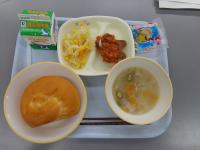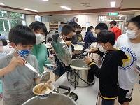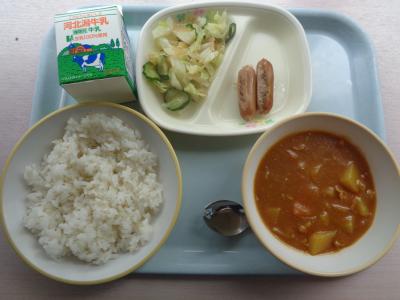 今日は、朝から激しい雨が降り、学校中が蒸し暑い一日となりました。一週間のスタートの月曜日なのですが、疲れた様子の子どもたちもちらほら・・・。そんな中、今日の給食はチキンカレー。子どもたちに人気のメニューです。