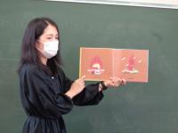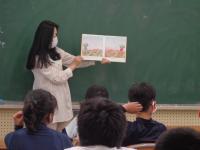 と元気いっぱいに子どもたちに声をかけながら教室に入ります。5年1組は他の教室より広いため、少し大きな声を出さないと後ろの子まで英語が届きません。ずっと元気いっぱいな声で読み聞かせをしていました。マスクが2重なので、たぶん、とても疲れると思いますが、終始笑顔で動作もつけながらの楽しい読み聞かせ。はじめは、先生の言っていることがよく分からなくて、戸惑い気味の子もいたけれど、荒木先生の動きを見ながら、少しずつ理解できて、引き込まれて行ってました。友達同士で、「これって・・・・だよね。」と確認し合っている様子も見られました。