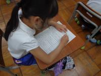 アサガオの観察カードを読み返し、よりよい書き方について考えていました。「ちゃいろ」だけでなく、「いろは、ちゃいろです。」と文の形でかくといいねと指導されると、「わたし、書いてあった!」と嬉しそう。