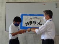 まずは、1学期工夫して充実した自学帳に取り組んだ「ハマナスマイスター」の表彰を行いました。各教室のマイスターを代表して6年生の加藤さんが、校長先生から賞状をいただきました。